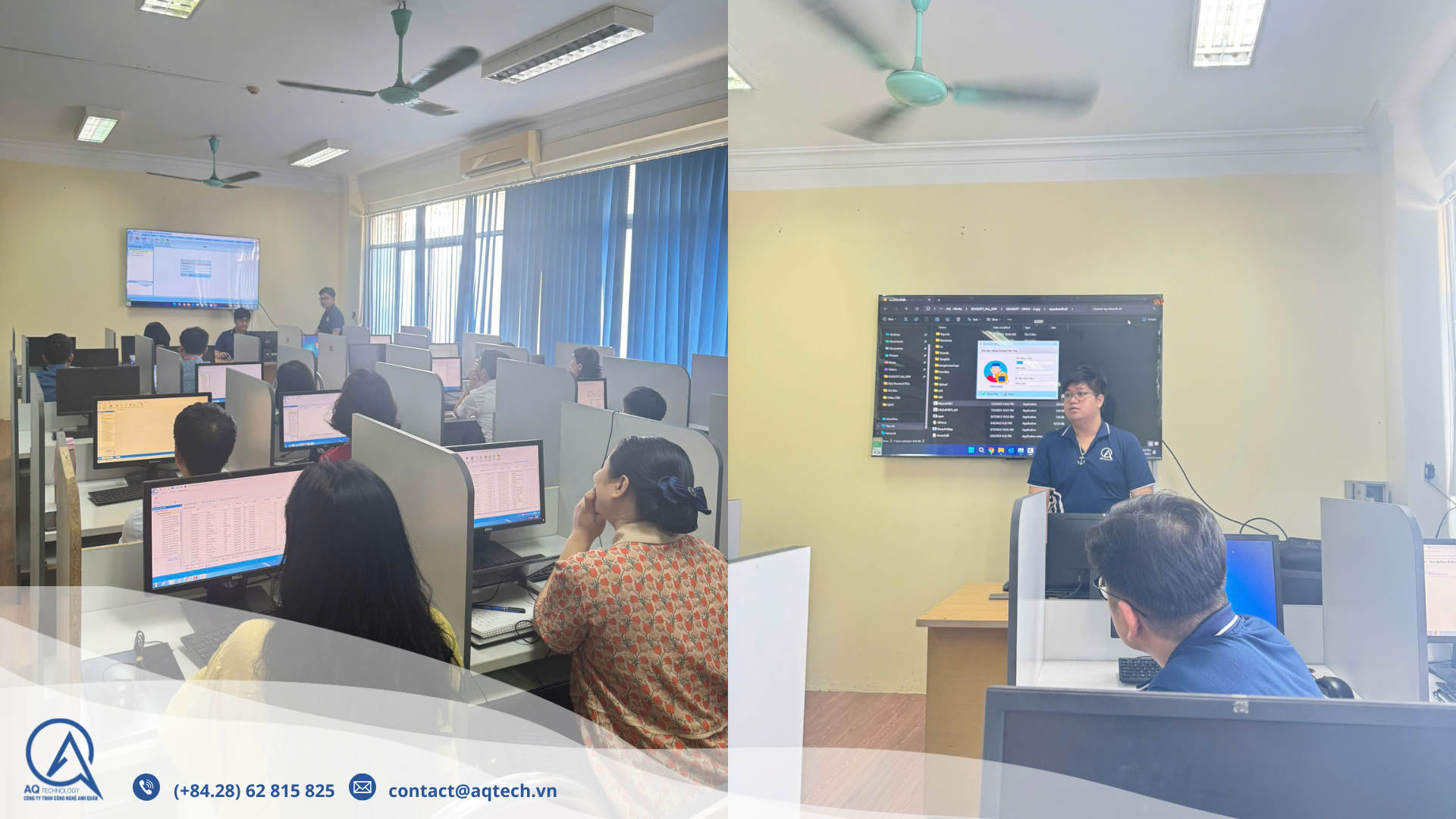Hình ảnh: Chuyên gia AQTech trực tiếp hướng dẫn giảng viên Đại học Hùng Vương thao tác và sử dụng hệ thống AQ EduSmart