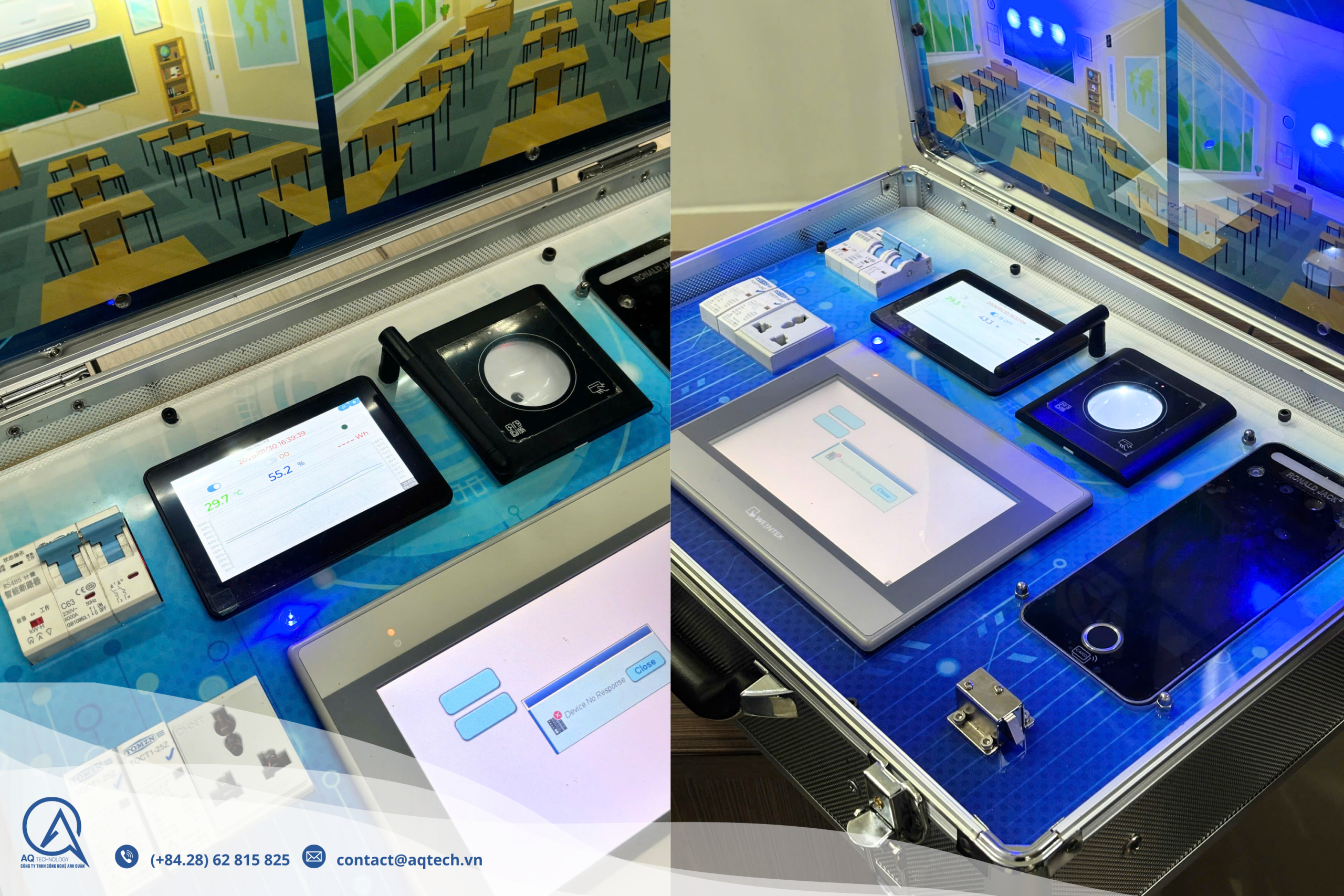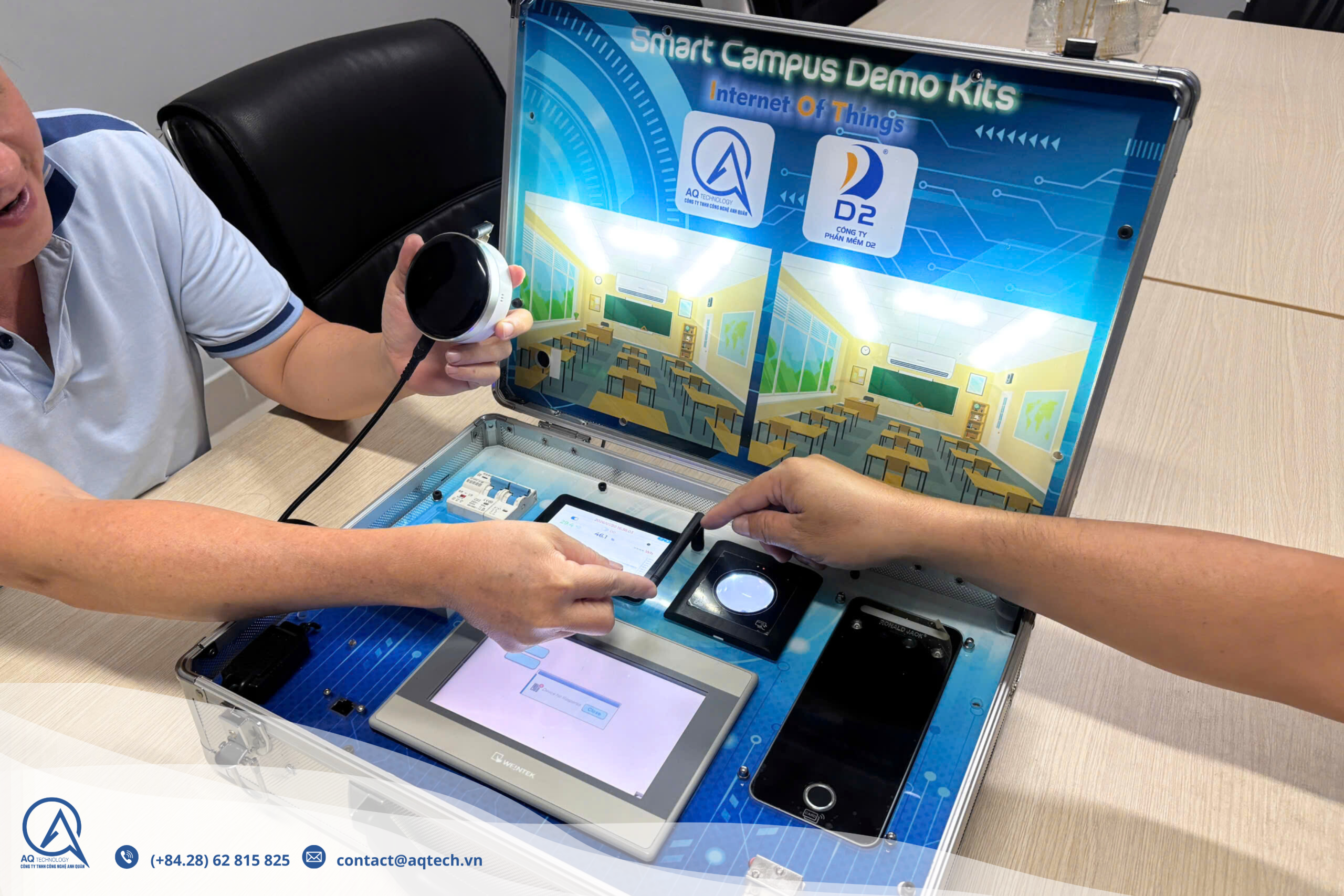 Đi kèm với giải pháp Smart Campus là bộ Smart Campus Demo Kits, được thiết kế như một mô hình minh họa lớp học thông minh hoàn chỉnh. Bộ demo được đặt trong vali chuyên dụng, thuận tiện cho việc trưng bày, đào tạo, giới thiệu giải pháp hoặc triển khai thử nghiệm tại các trường học, trung tâm đào tạo và đơn vị nghiên cứu. Thông qua bộ demo này, người dùng có thể hình dung rõ cách một lớp học thông minh vận hành trong thực tế, từ quản lý sinh viên, điều khiển thiết bị cho đến giám sát môi trường học tập.